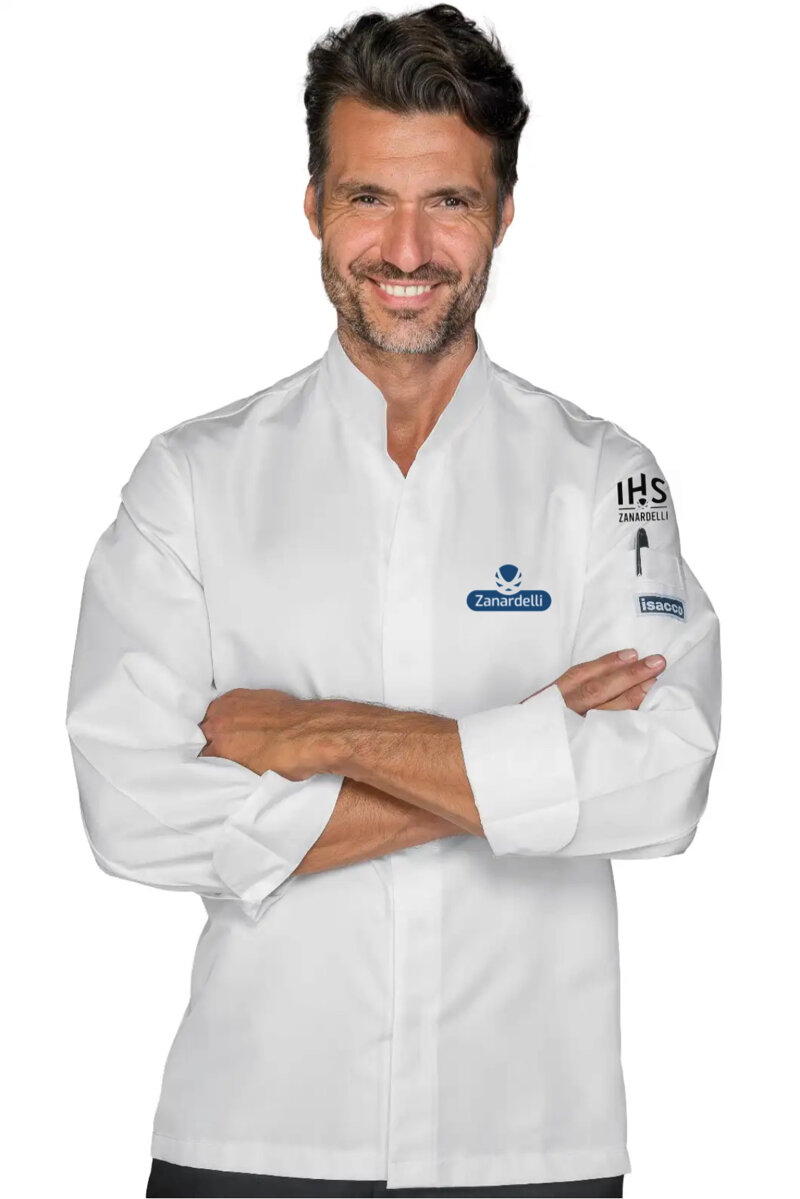 GIACCA DA CUCINA UOMO, ABBOTTONATURA A CLIP CENTRALE, COLLETTO ALLA COREANA, TASCHINO SUL BRACCIO, CON LOGO CFP ZANARDELLI RICAMATO A FILO SUL PETTO LATO SINISTRO E LOGO IHS RICAMATO A FILO SULLA SPALLA SINISTRA.